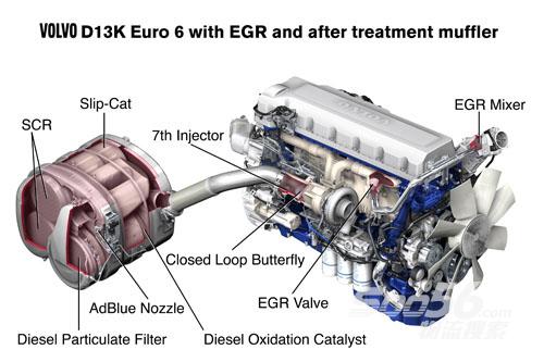 这款沃尔沃D13欧六发动机在历经考验的欧五发动机技术基础上制造。新款直列六缸欧六发动机采用单体喷油嘴和选择性催化还原技术(SCR),为了满足新的排放要求的废气再循环技术(EGR)与柴油颗粒过滤器(DPF) 也会装配其中,沃尔沃卡车已经在美国和日本使用了DPF达数年之久。相比于欧五,欧六发动机氮氧化物的排放减少了77%,固体颗粒物的排放减半。