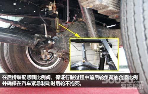 在车桥上装配了感载比例阀,它通过车身与车桥之间的距离变化来改变弹簧的预紧力,保证车辆在行驶的过程中,前后轮负荷的合适比例并确保在汽车紧急制动时不会发生后轮抱死的状况。