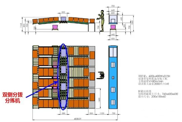 (5)出库箱分配有集货位,分拣口没有放托盘,而是直接用小推车从分拣口搬运到集货位,出库复核用RF。