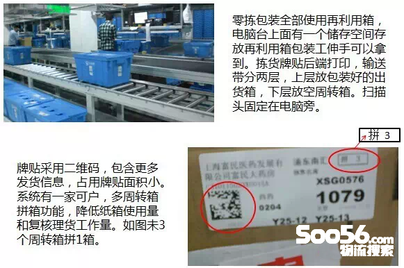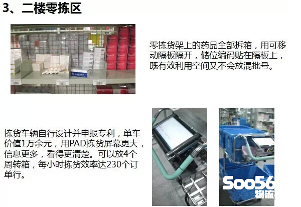 九州通仓库物流工艺设计是自己做的,设备是阳程科技,在设备上选用了纸箱悬挂系统、周转箱回收线、拆零拣选小车(有专利)、拆零内复核集货台、预拣货台、收货台车、电子标签拣货(作为A类品拣选,该区域目前应用效果不是很好,主要是其订单结构造成,笔者参观了诸多快批业态的物流中心,A类品拆零拣选应用电子标签效果都不是很好,主要是每个订单的笔数(EN)不是很多,因此每个出库箱在每个区拣货笔数不多)等,其中预拣货台应用不是很好,基本停用,拆零拣选小车应用为主,效率较高。