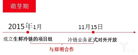京东生鲜2015年1月正式成立生鲜冷链的项目组,同年的11月15日推出了生鲜冷链的解决方案,冷链业务正式的对外开放,业务覆盖全国35个城市。这一阶段的京东生鲜属于萌芽期。由于京东做B2C电商起家,所以他们在切入生鲜冷链这方面并没有成熟的经验和丰富的具体操作流程。所以他们在这样一个阶段选择了与国内生鲜冷链的最大的供应商郑明物流进行合作。在这个阶段,他们主要是依赖于郑明物流。
