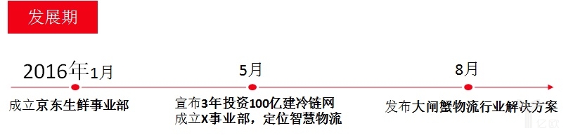 到了2016年的1月,京东正式的成立了京东生鲜事业部。同年的5月,京东对外宣布三年内将投入100亿构建冷链大网。5月12日京东物流X事业部成立,定位智慧物流体系。2016年的8月8日又发布了大闸蟹物流的行业解决方案。2017年1月4日-15日,年货季日生鲜品类同比销售增四倍。这一阶段京东生鲜进入了一个发展期。
