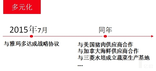 京东生鲜在经历了萌芽期及发展期的积累,逐步培养了自身的自营能力。同时,京东生鲜还进行了相应的投资。2017年7月,京东与雅玛多达成了战略协议。同年,京东还做了许多多元化的动作,包括与美国猪肉供应商合作、与加拿大海鲜供应商合作、以及与三菱水培成立蔬菜生产基地。这也标志着京东生鲜正式进入了多元化快速发展期。