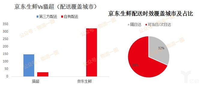 那么京东生鲜目前的整个配送能力又如何?目前,京东生鲜业务覆盖了300+个城市,其中68%的城市实现了当日达和次日达。相对而言,猫超生鲜,支持自配的城市是不到30个,加上第三方配送的城市合计只有不到180个。在这一方面很明显京东占据很大的配送区域的优势。