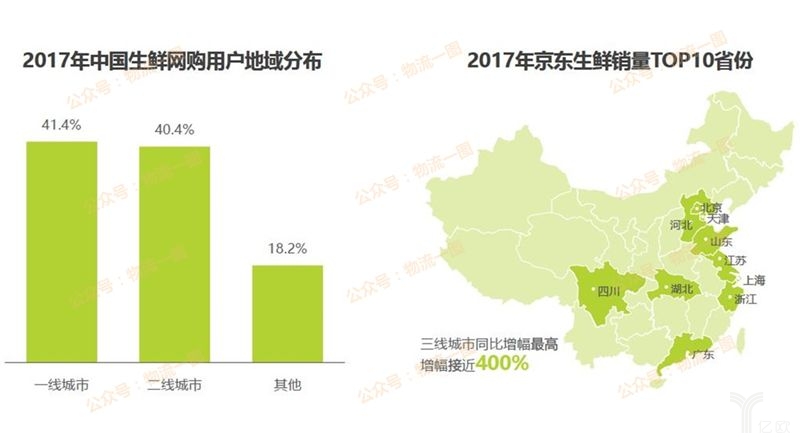 2017年整个京东生鲜的销售重点区域,在整个中国31个省市自治区中,Top10的省份包含了北京、天津、河北、山东、江苏、上海、浙江、湖北、广东和四川。2017年整个中国生鲜网购的地域分布方面,第一线城市占41.4%、二线城市占40.4%、其他城市占18.2%。