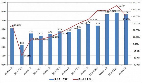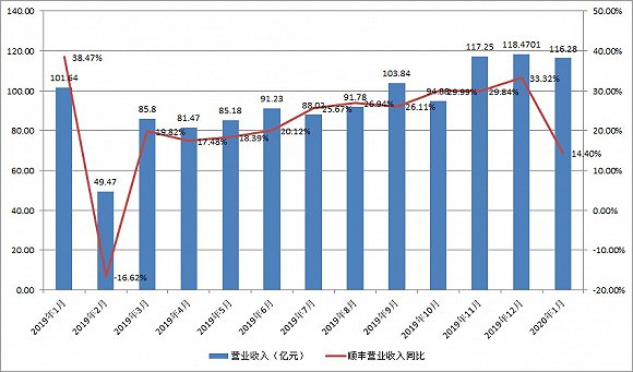 在同日披露的今年1月的经营简报中,顺丰在2020年1月实现营收(含供应链业务)116.28亿元,同比增长14.40%;业务量达到5.66亿票,同比增加40.45%。数据显示,从2019年11月至2020年1月,顺丰的单月快递业务件量均达到5亿票以上。