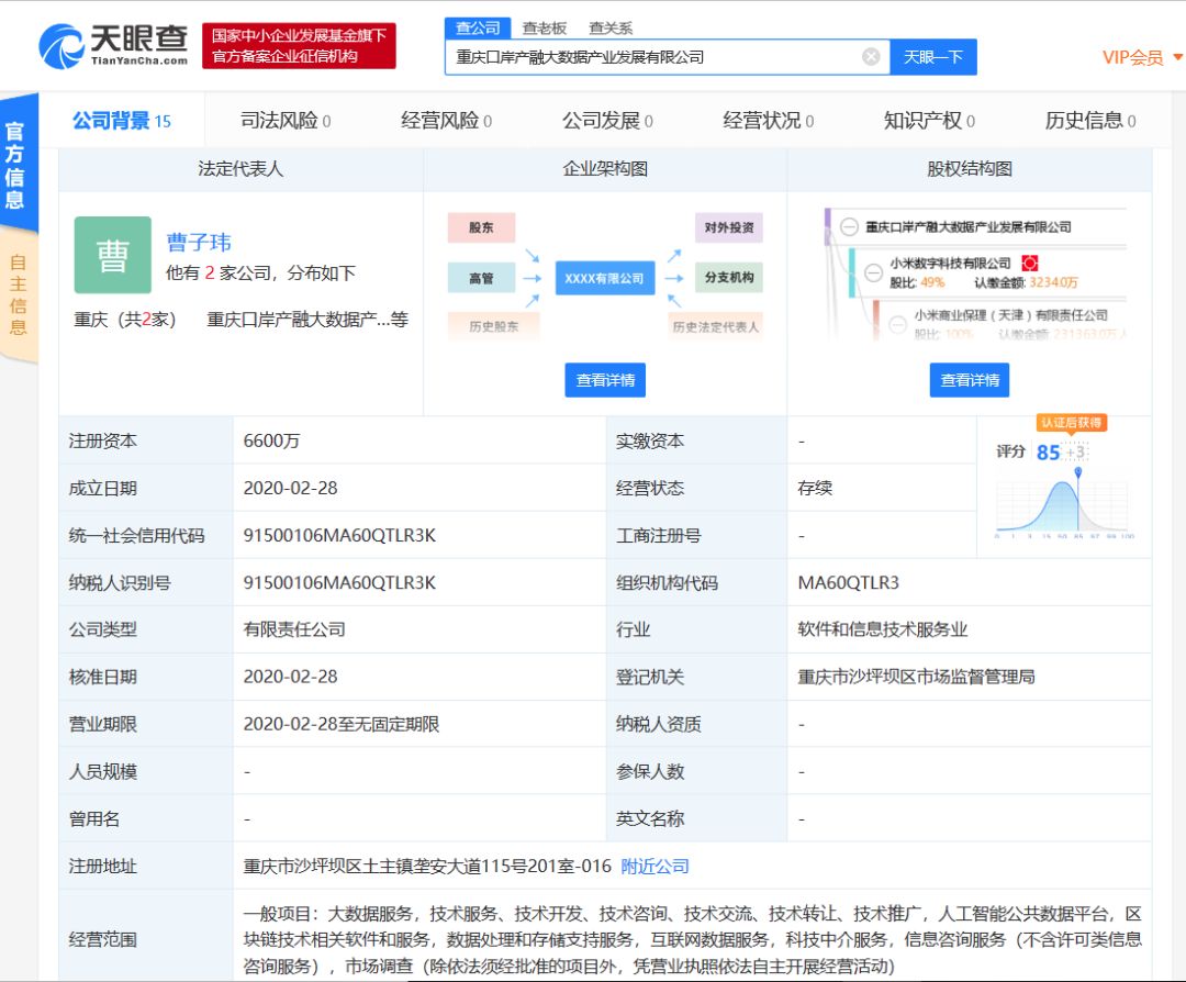 2月28日,小米数字科技有限公司新增对外投资,成立重庆口岸产融大数据产业发展有限公司。该公司注册资本6600万元,法定代表人、董事长为小米金融战略副总裁曹子玮,其经营范围包括大数据服务、人工智能公共数据平台、区块链技术相关软件和服务、数据处理和存储支持服务、互联网数据服务、科技中介服务等。天眼查股权结构显示,小米数字科技有限公司为该公司大股东,持股49%。