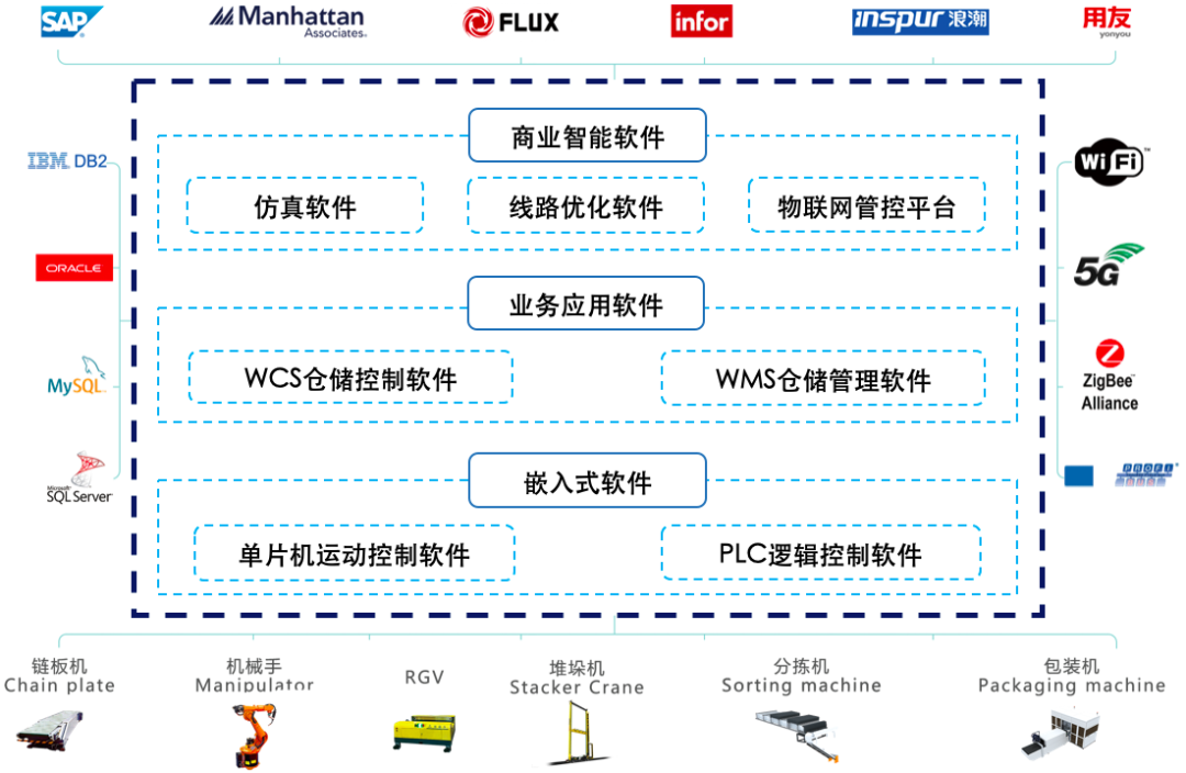兰剑的智能化软件系统具有丰富的集成经验,能够与 SAP、浪潮 ERP、用友 ERP 等国内外知名 ERP 系统,与DB2、Oracle、MySQL、SQL Server 等各类数据库,与Wi-Fi、5G、ProfiBus 等不同通讯方式,与堆垛机、穿梭车、AGV、输送线、分拣机、包装机、机械手等自动化物流设备进行高效、顺畅的集成、对接。